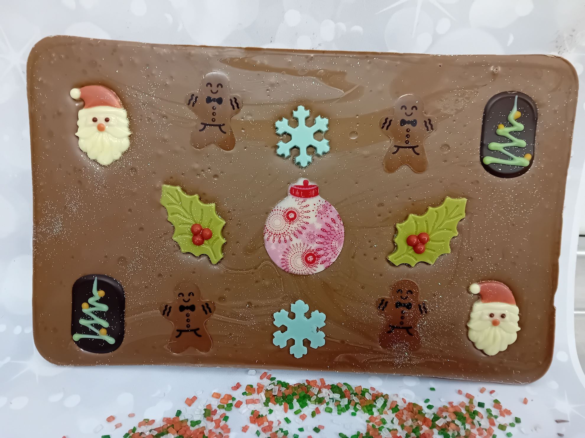 A Half Kilo of finest Belgian Couveture with Milk, Dark and White Chocolate, with a festive decoration and a sprinkle of edible glitter.